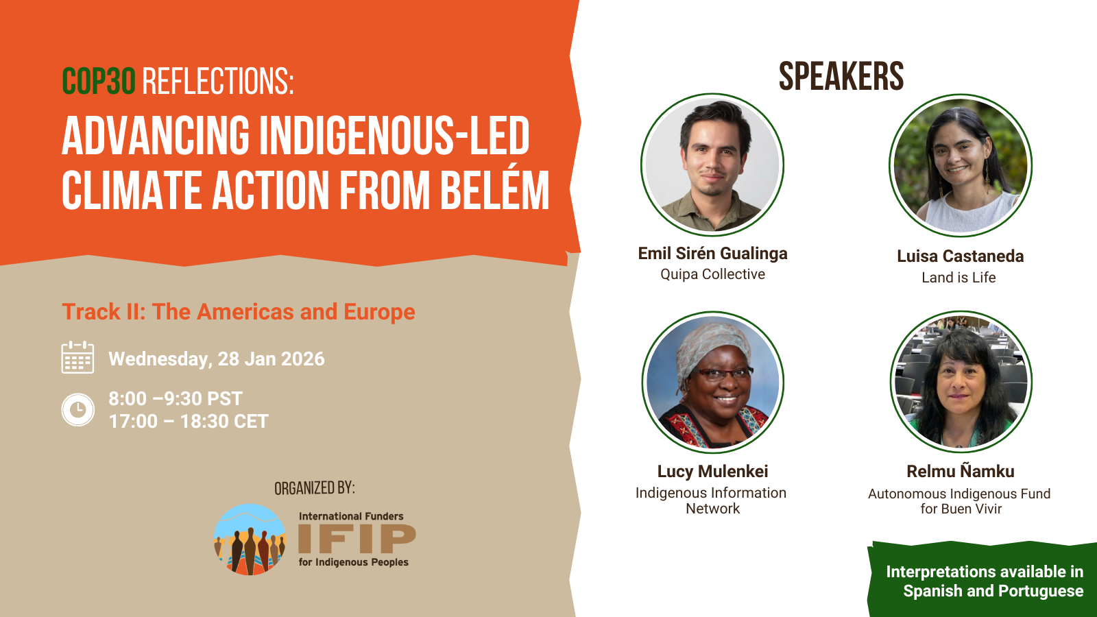 Join IFIP for the first of two post-COP30 reflection webinars—Track II (Americas & Europe)—as we reflect on key outcomes from COP30 in Belém and what they mean for Indigenous Peoples and climate finance. Bringing together Indigenous leaders, partners, and funders, the conversation will explore how Indigenous priorities were reflected in the COP30 agenda, assess major climate finance announcements and commitments, and examine where gaps and barriers remain.